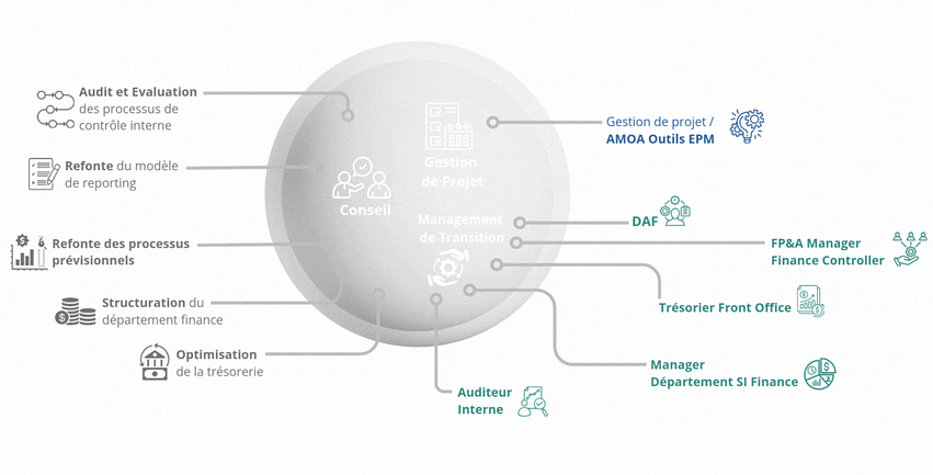Nous intervenons aussi dans le cadre de transformation globale ou dans le cas de difficultés de l’entreprise impactant la direction financière.